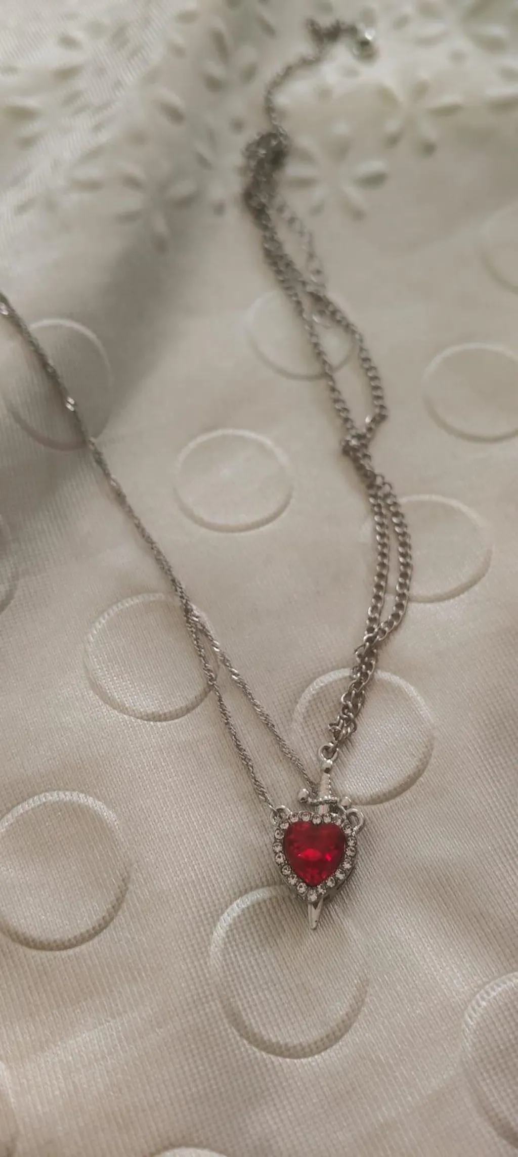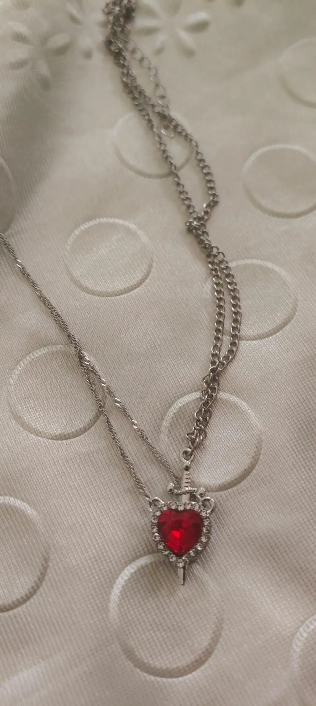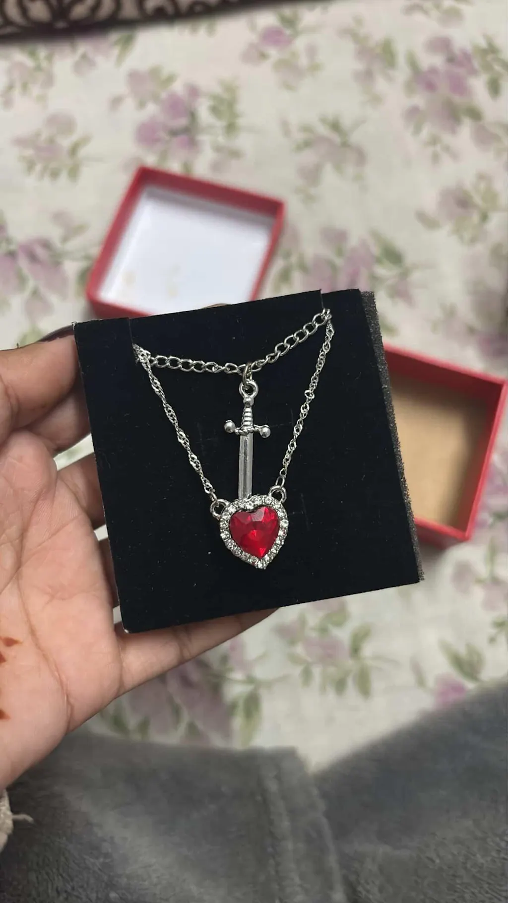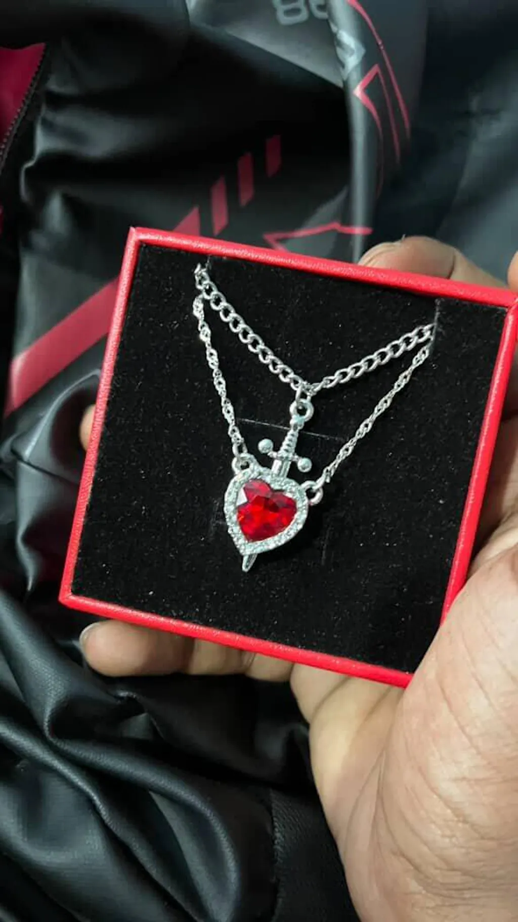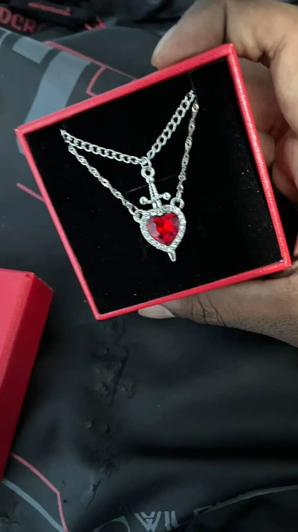 1. Dual pendant set – a deep red heart and a detailed silver sword.